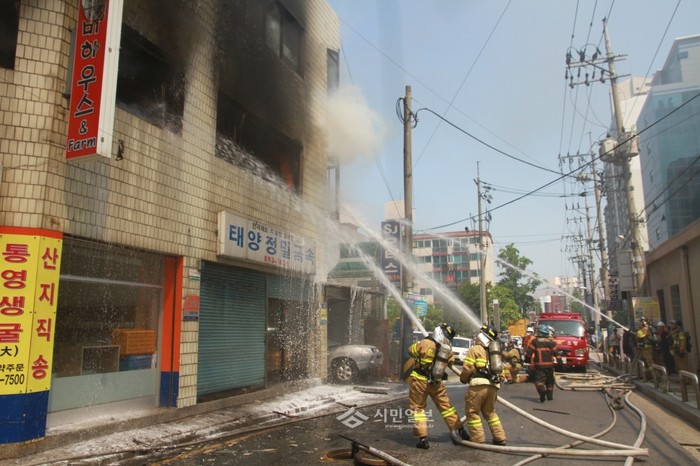 서울 구로소방서가 최근 금천구 독산동 소재 봉제공장 2층에서 원인미상의 화재가 발생해 화재를 진압하고 요구조자 1명을 구조했다. 사진은 이날 소방대원들이 화재 진압 중인 모습.(사진제공=구로소방서)