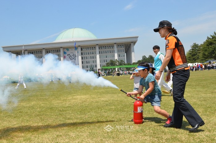 영등포소방서가 최근 국회의사당 잔디마당에서 열린 국회동심한마당 행사에 참여하는 시민들을 대상으로 운영한 '찾아가는 119이동 안전체험장'에서 참여 어린이가 연기소화기 체험을 하고 있다. (사진제공=영등포소방서)