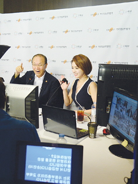 황우여 사회부총리 겸 교육부 장관이 26일 오후 서울 여의도 콘래드호텔에서 농산어촌 학생들에게 ICT 원격영상으로 진로멘토링을 하고 있다.