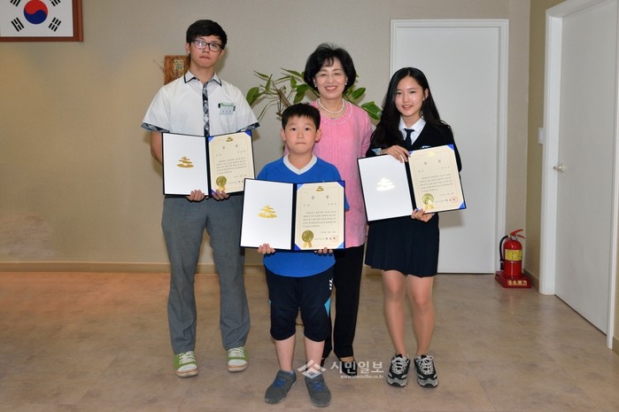 송파구가 지난 26일 구청장실에서 '청소년 문화공간 명칭 공모' 수상자에 대한 시상식을 개최해 박춘희 송파구청장(가운데)과 수상자들이 함께 기념촬영하고 있다. (사진제공=송파구청)
