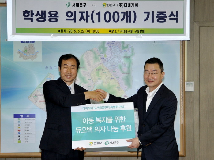 서울 서대문구가 (주)디비케이와 27일 구청 회의실에서 저소득층 어린이들을 위한 '학생용 의자 기증식'을 했다. 사진은 문석진 서대문구청장(왼쪽)과 오준석 (주)디비케이 부사장이 기증식에서 기념촬영한 모습. (사진제공=서대문구청)