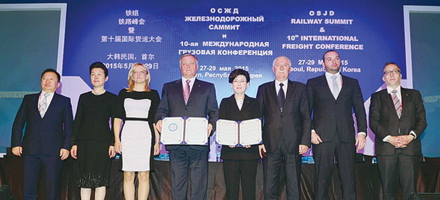 27일 오후 서울 구로구 쉐라톤 서울 디큐브시티 호텔에서 열린 ‘OSJD 사장단회의 및 제10차 국제철도물류회의’에서 최연혜(오른쪽에서 네번째) 코레일 사장과 블라디미르 이바노비치 야쿠닌 러시아 철도공사 사장이 ‘서울선언문’ 채택을 마친 후 참석자들과 기념촬영을 하고 있다. 왼쪽부터 카자흐스탄 마민 아스카 철도공사 사장, 카자흐스탄 쥬바이다 아스파예바 OSJD 물류분과위원장, 헝가리 일로나 다비드 철도공사 사장, 러시아 블라디미르 이바노비치 야쿠닌 철도공사 사장, 최 사장, 폴란드 따데우쉬 쇼즈다 OSJD 의장, 그루지아 마무?바크타츠 철도공사 사장, 폴란드 자쿠브 칼노위스키 철도공사 사장.