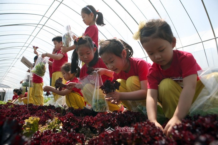 강동구가 최근 강일텃밭내에 '친환경농가 체험학습장'을 개장했다. 사진은 체험학습장에 참가한 어린이들이 채소를 수확하고 있는 모습. (사진제공=강동구청)