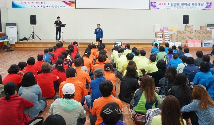 서울 은평구는 최근 팀비젼센터 대강당에서 자활기금을 활용해 자활근로사업 참여자 및 실무자들을 대상으로 화합의 장을 마련하고자, '2015 자활캠프, 한마음 체육대회'를 실시했다. 사진은 김우영 구청장이 참여자들에게 강연하는 모습.(사진제공=은평구청)