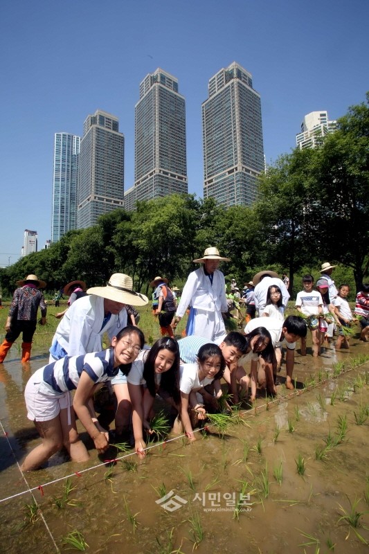 지난 26일 서울 강남구 양재천 벼농사학습장에서 실시한 ‘전통 모내기 체험행사’에 참가한 아이들이 논에서 해맑은 얼굴로 못줄에 따라 모를 심고 있다.