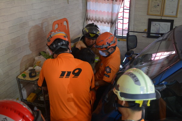 서울 동작소방서가 최근 신대방동에서 승합차량이 경사진 곳에서 내려오다 멈추지 못하고 미용실 전면을 뚫고 돌진해 발생한 사고에 출동해 구조작업을 실시하고 있다.(사진제공=동작소방서)