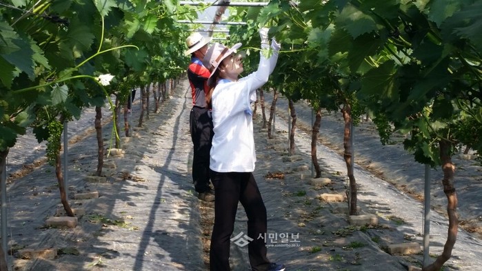 경북 구미시 위생과는 직원 10여명이 참여한 가운데 최근 무을면 소재 농가를 찾아 포도순 따기 농촌 일손돕기에 나섰다. 사진은 이날 일손돕기에 참여한 직원들이 포도순을 따고 있는 모습.