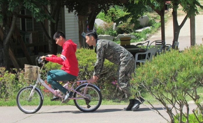 지역내 중증장애시설에서 봉사를 실천해 오고 있는 육군5사단 사자연대 '사자봉사단'이 최근 지역내 장애시설을 찾아 자전거 타기 봉사를 진행하고 있다.(사진제공=연천군청)