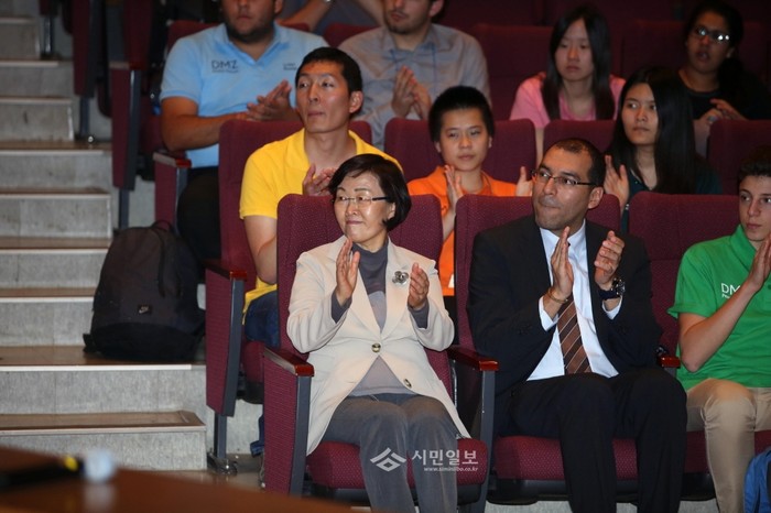 최근 신연희 서울 강남구청장(왼쪽)이 국악고등학교에서 ‘남북한 냉전의 실태와 해소 방안’을 주제로 미국·호주·노르웨이·덴마크 등 해외 청소년 대표와 한국 청소년이 함께 토론을 펼치는 ‘2015 세계평화 청소년리더십 포럼’에 참석해 세계 청소년들을 환영하고 있다.