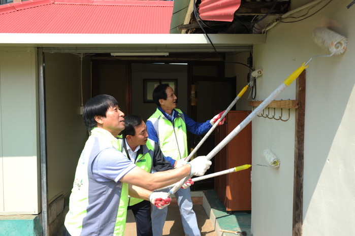 최근 농협 NH개발에서 주관한 경기 오산시 거주 홀몸노인 '사랑의 집 고치기 사업'이 진행돼 참여자들이 지역내 홀몸노인의 집을 찾아 낡은 벽면에 페인트 칠을 하고 있다.(사진제공=오산시청)