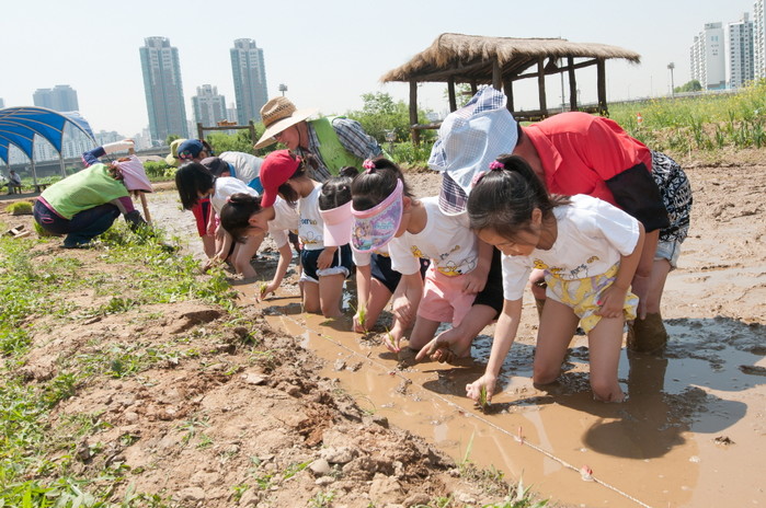지난달 28일 오전 서울 양천구는 '도심 속 모내기 체험행사'를 열었다. 체험에 참가한 어린이들이 안양천에서 모를 심으며 즐거운 시간을 보내고 있다.(사진제공=양천구청)