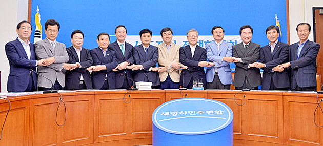 31일 오전 서울 여의도 국회에서 열린 새정치민주연합 시·도지사 정책협의회에서 당 지도부와 시·도지사들이 기념촬영을 하고 있다. 왼쪽부터 박원순 서울시장, 이시종 충북도지사, 권선택 대전시장, 윤장현 광주시장, 송하진 전북도지사, 이춘희 세종시장, 이종걸 원내대표, 문재인 대표, 신기남 참좋은지방정부위원회 공동위원장, 이낙연 전남도지사, 안희정 충남도지사, 최문순 강원도지사.