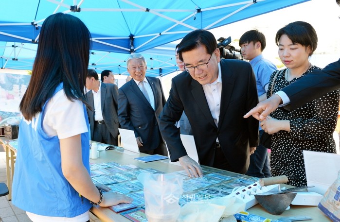 동대문구 청량리역 광장에서 최근 민주평화통일자문회의 동대문구협의회 주최로 '북한 장마당 재연행사'가 열려 유덕열 동대문구청장(가운데)이 북한 화폐를 살펴보고 있다. (사진제공=동대문구청)