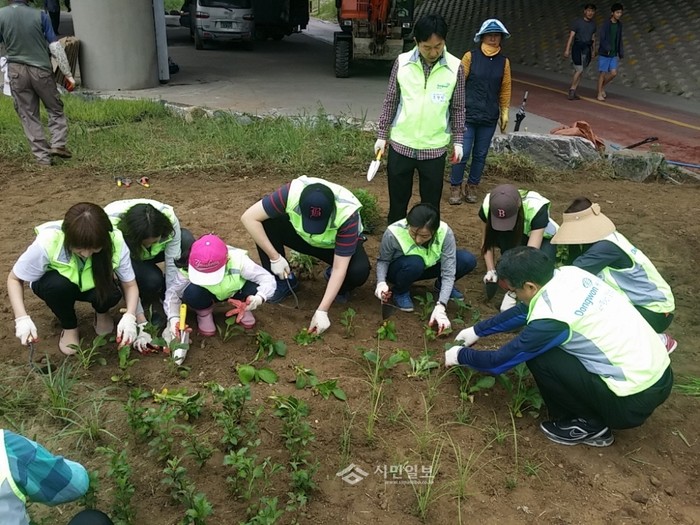 동원산업·현대제철, 양재천 둔치에 꽃모종 심어