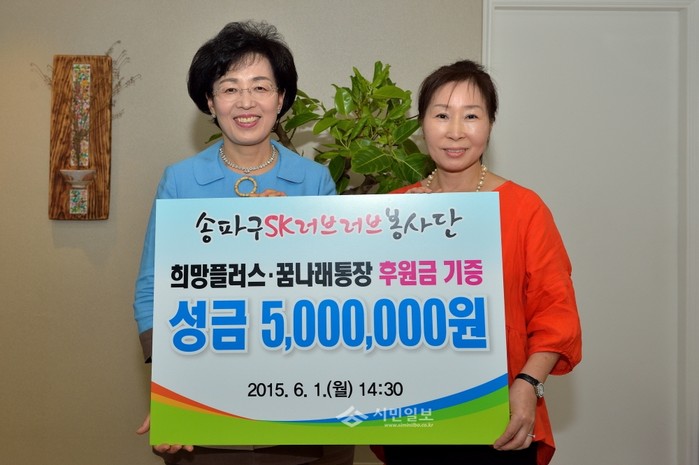 지난 1일 박춘희 서울 송파구청장(좌)이 구청장실에서 2008년 송파구와 서울 SK 나이츠 프로농구단과 협약을 통해 설립된 SK러브러브봉사단 정서율 송파구 단장(우)으로부터 꿈나래 통장 후원금으로 500만원의 성금을 전달받고 기념촬영을 하고 있다.(사진제공=송파구청)