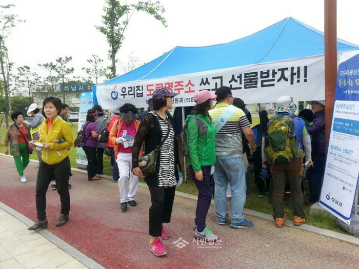 지난 1일 경기 하남유니온파크에서 하남시청 종합민원과 직원들이 시민들을 대상으로 집주소를 도로명주소로 직접 써보게 하고 칫솔세트를 선물로 제공하는 등 도로명주소 사용 정착을 위해 실시하는 ‘도로명주소 홍보 행사’에 시민들이 참여하고 있다.(사진제공=하남시청)