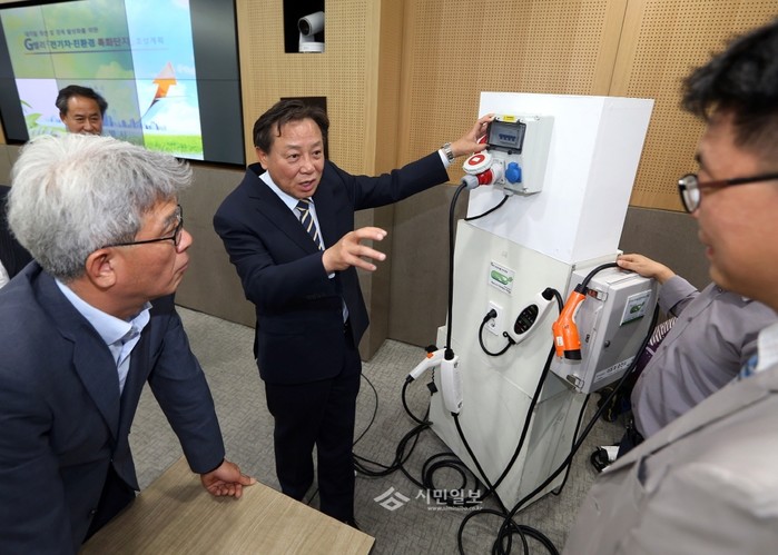 서울 금천구는 지난 2일 오후 3시 서울시 신청사 6층 영상회의실에서 대기질 개선 및 경제활성화를 위한 'G밸리 전기차·친환경 특화단지 공동실천 협약'을 체결했다. 사진은 차성수 금천구청장이 전기차 충전기에 대해 관계자와 대화를 나누고 있는 모습. (사진제공=금천구청)