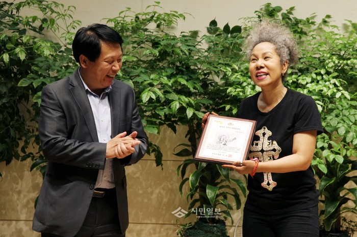 지난 2일 2010년부터 오류동 소재 ‘좋은 친구 장애인 주간보호시설’ 장애인들을 위해 재능기부로 무료공연을 펼쳐온 가수 인순이씨(오른쪽)가 이성 서울 구로구청장(왼쪽)으로부터 ‘우리동네 나눔반장’ 위촉패를 전달받고 기쁜 표정을 짓고 있다. (사진제공=구로구청)