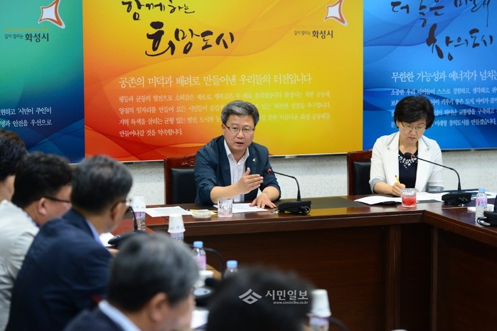 채인석 경기 화성시장이 지난 2일 메르스 확산 방지를 위한 긴급 국장단회의를 개최해, 지역내 의심자 발생 현황과 접촉자 관리 상황을 점검하고 노약자 시설운영과 향후 다중집합 행사 중단 등을 논의하고 있다.(사진제공=화성시청)