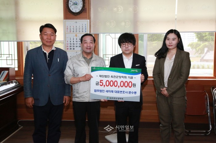 법무법인 새미래가 3일 오전 11시 충북 옥천군 군수 집무실에서 지역 인재양성을 위해 써달라며 (재)옥천군장학회에 장학금 500만원을 전달했다. 사진은 (왼쪽부터)조이실 사무국장, 김영만 옥천군수, 문수종 변호사, 이지혜 변호사의 모습.(사진제공=옥천군청)