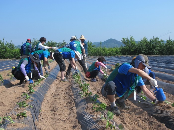 최근 서울 송파구자원봉사센터가 봉사단체 리더들과 함께 ‘나눔’과 ‘쉼’을 테마로 한 ‘2015 송파구 자원봉사단체 리더 워크숍’을 개최해 참가자들이 구 자매도시 경상북도 영덕 창수면의 한 농가에서 고구마 심기 봉사활동을 하고 있다.(사진제공=송파구청)