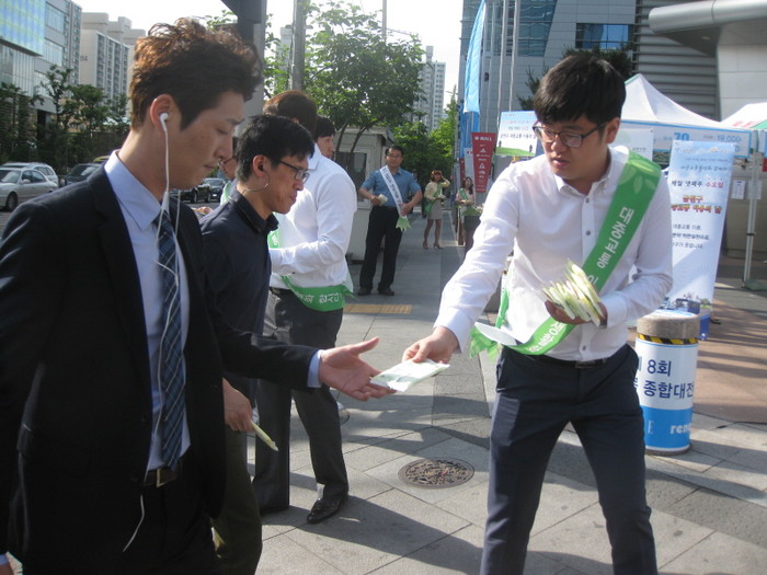 서울 금천구는 지난 3일 오전 7시30분부터 1시간 동안 W-MALL 앞 사거리에서 W-MALL, 금천경찰서와 합동으로 대중교통 이용과 선진 교통문화 정착을 위한 캠페인을 실시했다. 사진은 거리를 오가는 시민들에게 대중교통 이용 홍보물을 전하는 행사 참여자들의 모습. (사진제공=금천구청)