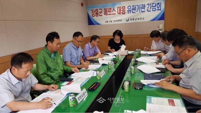 전남 장흥군이 최근 군 보건소에서 중동호흡기증후군(MERS) 대응 유관기관 긴급 간담회를 개최한 가운데 지역 경찰서, 소방서, 의사회, 약사회, 건강보험공단, 교육청 관계자 등이 참여해 메르스 예방 대책과 유사시 대응방안에 대한 논의를 진행하고 있다.