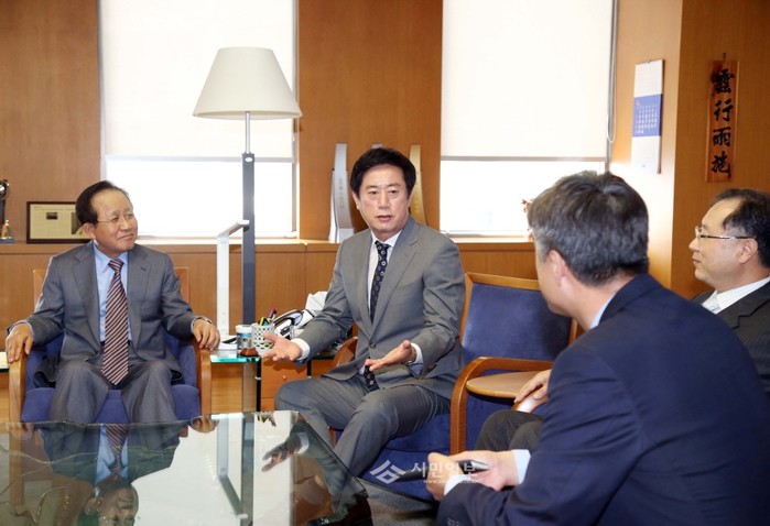 정찬민 경기 용인시장이 최근 기업유치를 위해 서울 마포구 도화동에 위치한 일진그룹 사옥을 전격 방문해 허진규 회장을 비롯한 임원진과 면담을 하고 있다.