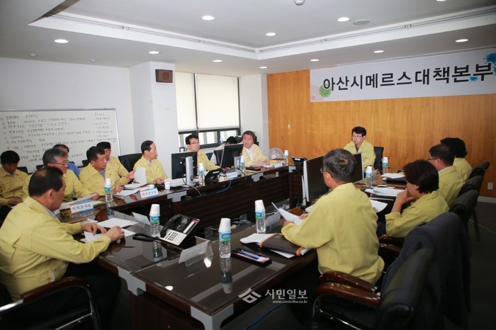충남 아산시가 최근 메르스 대책회의를 진행하고 메르스 확산방지에 총력을 다하고 있다. 사진은 복기왕 아산시장 및 관계자들이 대책을 마련하기 위한 회의를 진행하고 있는 모습.