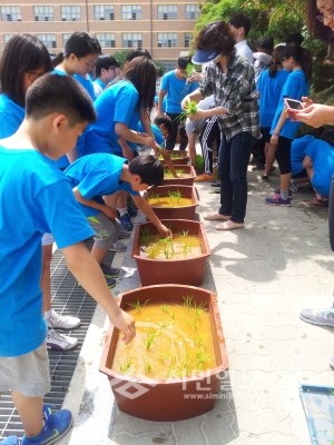 성북구는 최근 서울 숭례초등학교 운동장에서 전교생 909명을 대상으로 '유기농 학교텃논 모내기' 체험을 실시했다. 사진은 운동장에서 모내기 체험을 하고 있는 아이들의 모습. (사진제공=성북구청)