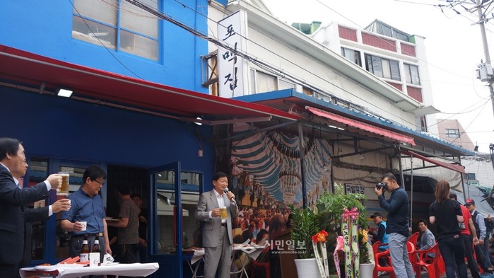 중구는 최근 신중부시장에서 최창식 구청장을 비롯해 상인 등 100여명이 참석한 가운데 시장내 호프타운 조성을 위한 포맥집(오장동 11-1)을 개장했다. 사진은 최창식 구청장이 포맥집 앞에서 인사말을 하는 모습. (사진제공=중구청)