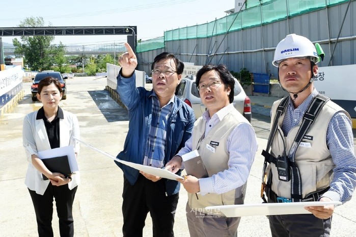 경기 광주시가 최근 풍수해 피해를 예방하기 위해 시 관리 시설물 및 공사장 등 753곳을 대상으로 사전 안전점검을 실시했다. 사진은 박덕순 광주시 부시장(왼쪽에서 두번째)이 현장에서 관계자들과 함께 점검을 진행하고 있는 모습. (사진제공=광주시청)