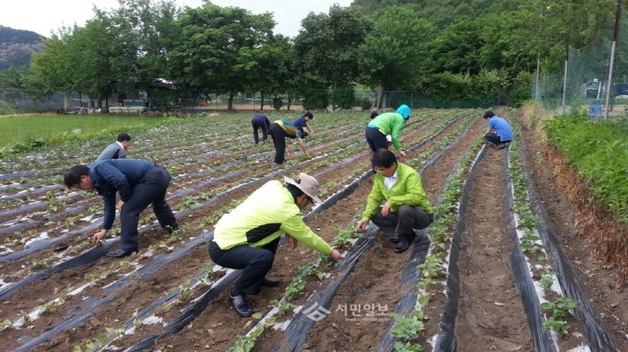 경북 구미시청 안전재난과에서는 최근 수점밤고구마 주 생산지인 수점동을 찾아 농촌봉사활동을 실시했다. 사진은 이날 안전재난과 직원들이 수점동 김인택씨의 고구마밭을 찾아 잡초제거 등의 봉사를 펼치고 있는 모습.(사진제공=구미시청)