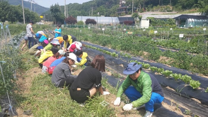경기 동두천시 불현동 주민자치위원회는 최근 어린이 주민자치위원 18명이 참여한 가운데 주말농장에서 고구마 심기 체험을 실시했다. 사진은 이날 체험학습에 참여한 어린이들이 텃밭에 고구마를 심고 있는 모습.