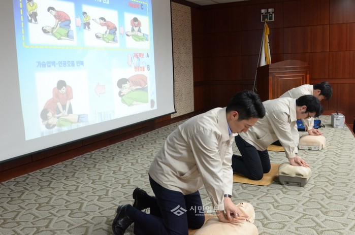 서울 영등포소방서는 최근 문래동 소재 푸르밀 교육장에서 임직원 80여명을 대상으로 심폐소생술 등과 관련된 소방안전교육을 실시했다. 사진은 이날 참여자들이 심폐소생술 교육을 받고 있는 모습.(사진제공=영등포소방서)