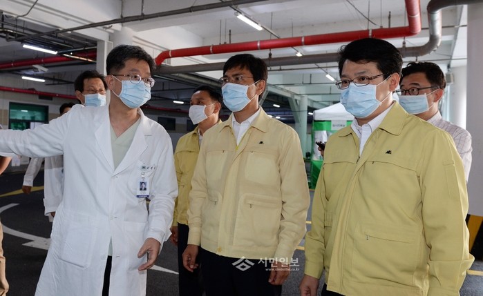 복기왕 충남 아산시장(오른쪽)이 지난 8일 오후 안희정 충남도지사(가운데) 등 관계자들과 함께 천안 단국대병원을 전격 방문해 병원 관계자 및 의료진을 만나 위로하고 있다.(사진제공=아산시청)