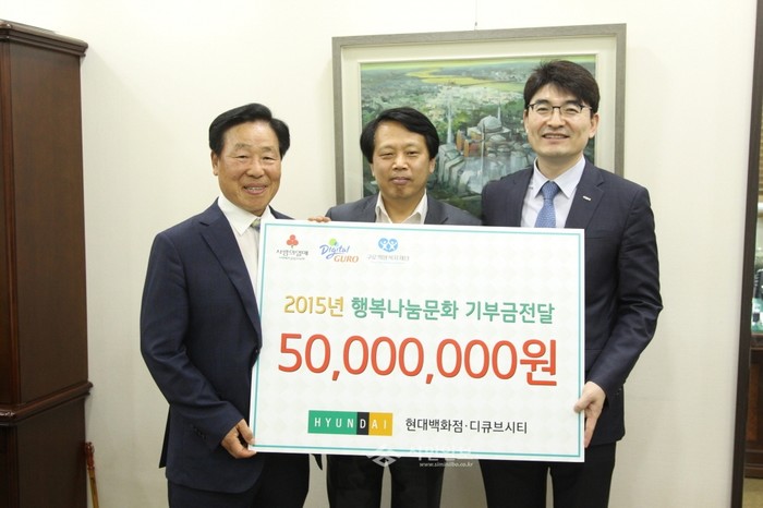 지난 9일 서울 구로구 현대백화점 디큐브시티점이 지역내 어려운 이웃을 위해 사용해 달라며 구로희망복지재단에 5000만원을 기부했다. 사진은 구청장실에서 열린 전달식에서 이성 구청장(가운데), 최보규 현대백화점 디큐브시티점 상무(오른쪽), 이형춘 구로희망복지재단 이사장(왼쪽)이 기념촬영하고 있다.(사진제공=구로구청)