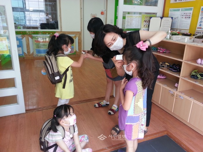대전 대덕구가 최근 메르스(MERS·중동호흡기증후군) 확산 방지를 위해 지역내 모든 어린이집이 휴원함에 따라 맞벌이 가정 등 긴급 보육 수요에 대비해 자체 당직교사를 배치했다. 사진은 당직교사들이 어린이들의 발열 체크와 손소독을 하고 있는 모습.(사진제공=대덕구청)