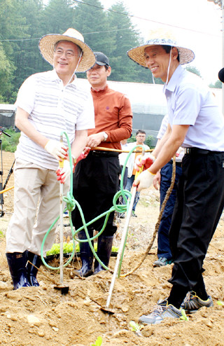 14일 새정치민주연합 문재인 대표가 강원 대관령면 횡계리 원예농협 2층 회의실에서 가뭄피해 상황을 보고 받은 후 극심한 가뭄으로 시름하고 있는 인근 채소밭을 찾아 대민 활동을 벌이고 있다.