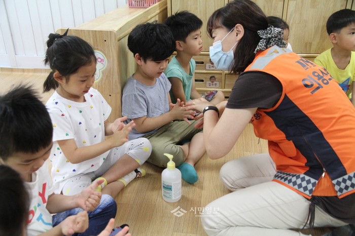 은평소방서가 최근 수색어린이집을 방문해 중동호흡기증후군(MERS·메르스)관련 위생 소독 및 안전교육을 실시했다. 사진은 이날 한 소방대원이 어린이들이게 손 소독방법을 교육하고 있는 모습.
