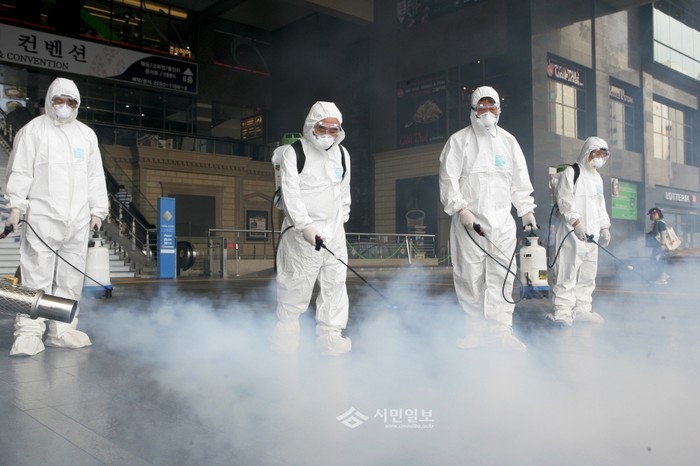 서울 성동구가 최근 다중이용시설을 대상으로 전지역 동시다발적인 메르스 방역작업에 나섰다. 사진은 왕십리역사 앞에서 구보건소 관계자들이 방역작업을 하고 있는 모습.