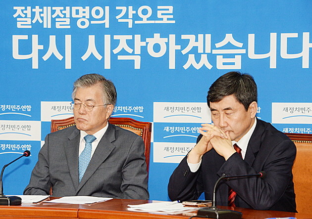 15일 오전 서울 여의도 국회에서 열린 새정치민주연합 최고위원회의에서 문재인 대표와 이종걸 원내대표가 굳은 표정으로 앉아 있다.