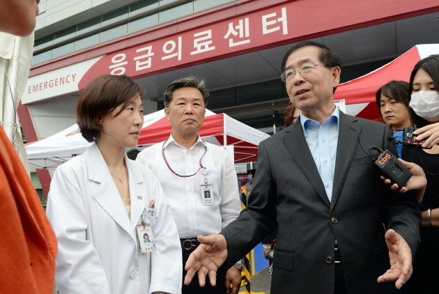 박원순 서울시장이 15일 오후 서울지역 메르스 국민안심병원으로 지정된 서울 고대구로병원을 찾아 응급의료센터 앞 선별진료실을 점검하고 있다.