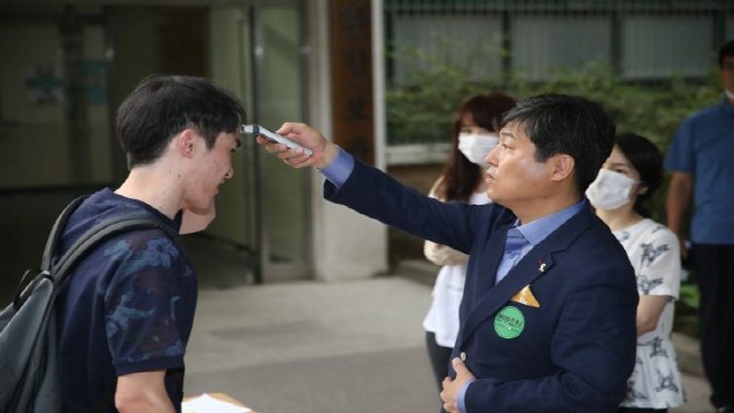 지난 13일 김영배 서울 성북구청장(오른쪽)이 최근 메르스 확산 우려 속에 실시된 서울시 공무원 필기시험이 치러지는 지역내 시험장을 방문해 수험생의 체온을 직접 측정하고 있다. (사진제공=성북구청)