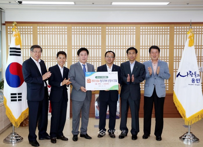 지난 15일 경기 용인시를 방문한 NH농협 용인시지부가 정찬민 시장(왼쪽에서 세 번째)에게 지역내 농·축협 임직원들이 모아온 ‘개미천사(1004) 정기기부 신청서’ 1004구좌를 전달하고 기념촬영을 하고 있다.(사진제공=용인시청)