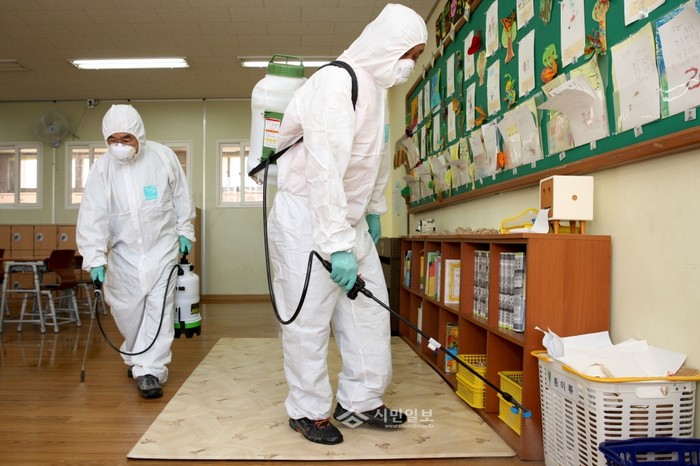 서울 성동구보건소 방역반은 최근 메르스로 인해 휴업기간 중인 마장초등학교를 찾아 소독을 실시했다. 사진은 방역반이 교실 구석구석을 소독하고 있는 모습. (사진제공=성동구청)
