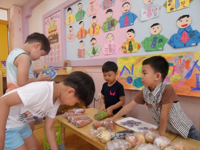 경북 구미시 옥계동부초등학교 병설유치원이 최근 원아들을 대상으로 알뜰시장놀이를 실시했다. 사진은 이날 참여 어린이들이 싱싱 채소가게를 직접 운영하며 채소를 팔고 있는 모습.(사진제공=구미교육지원청)