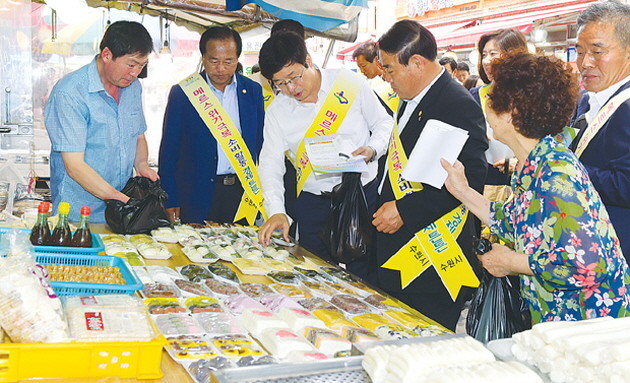 메르스(MERS·중동호흡기증후군) 여파로 지역상권이 크게 위축된 가운데 16일 염태영 수원시장과 시의원 등이 메르스 전문병원인 경기도의료원 수원병원 인근에 위치한 전통시장을 찾아 소비활동 촉진 캠페인을 벌이며 물건을 구입하고 있다.