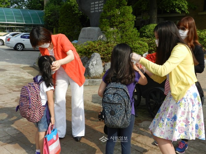 경기 부천시 석천초등학교 전담교사 10명이 최근 메르스 확산 예방 및 학생 건강관리를 위해 등교하는 학생들을 대상으로 발열점검을 진행했다. 사진은 발열점검 중인 교사와 학생들의 모습. (사진제공=부천교육지원청)