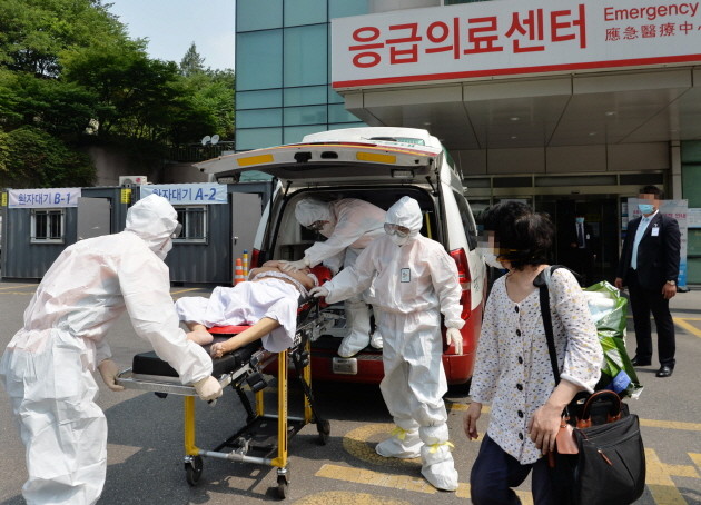 16일 오전 응급실 폐쇄 이틀 만에 응급실 운영을 재개한 서울 동작구 보라매로 보라매병원 응급실로 방호복을 입은 구급대원들이 응급환자를 이송하고 있다.